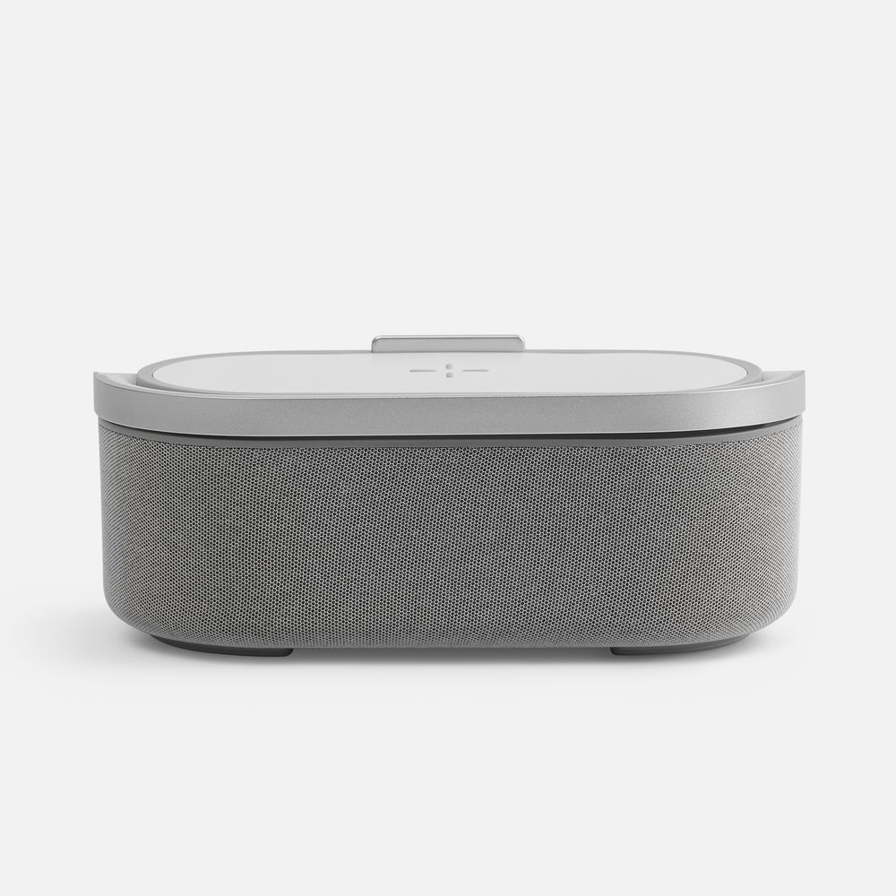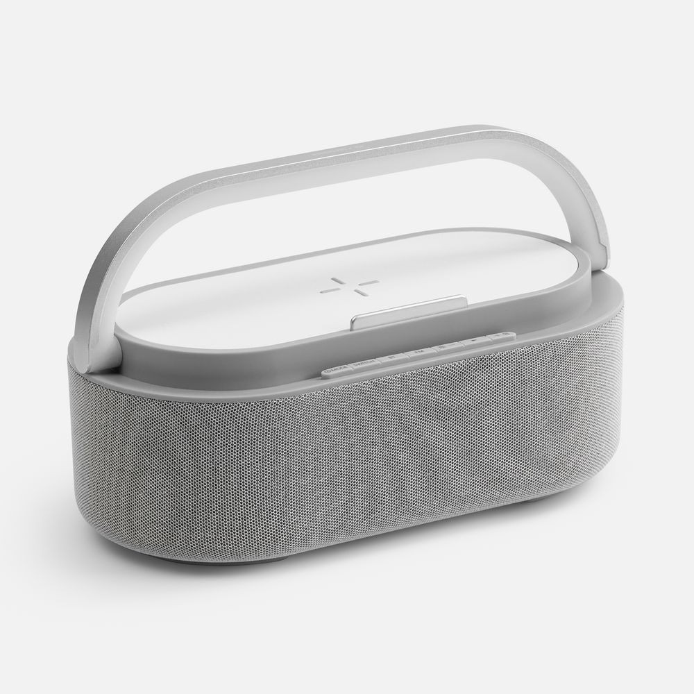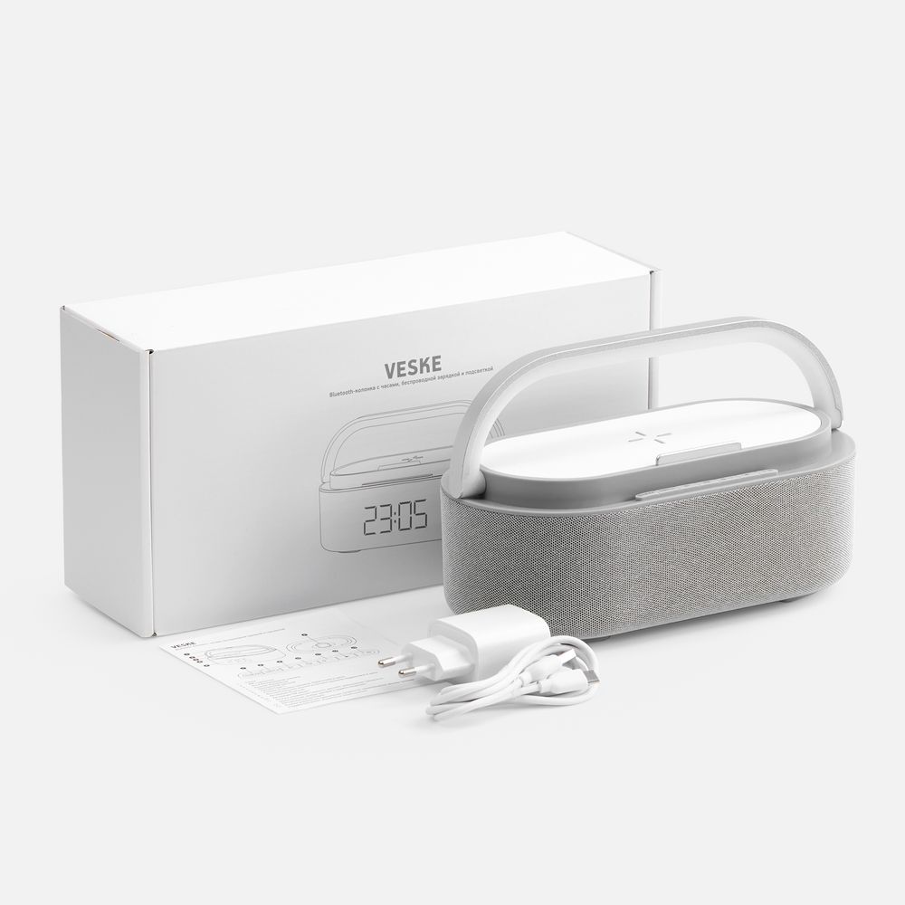 Veske — это Bluetooth-колонка с электронными часами, площадкой для беспроводной зарядки смартфона и подсветкой.