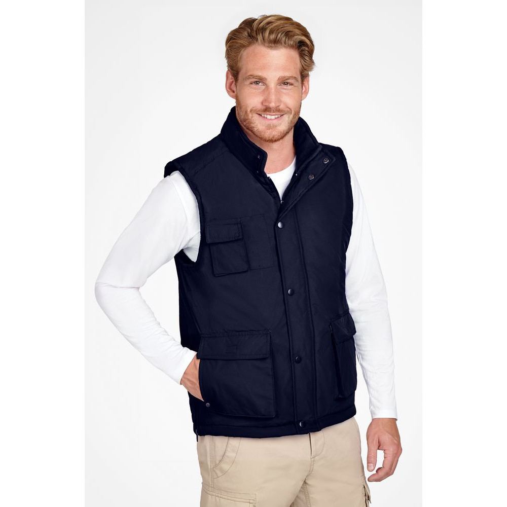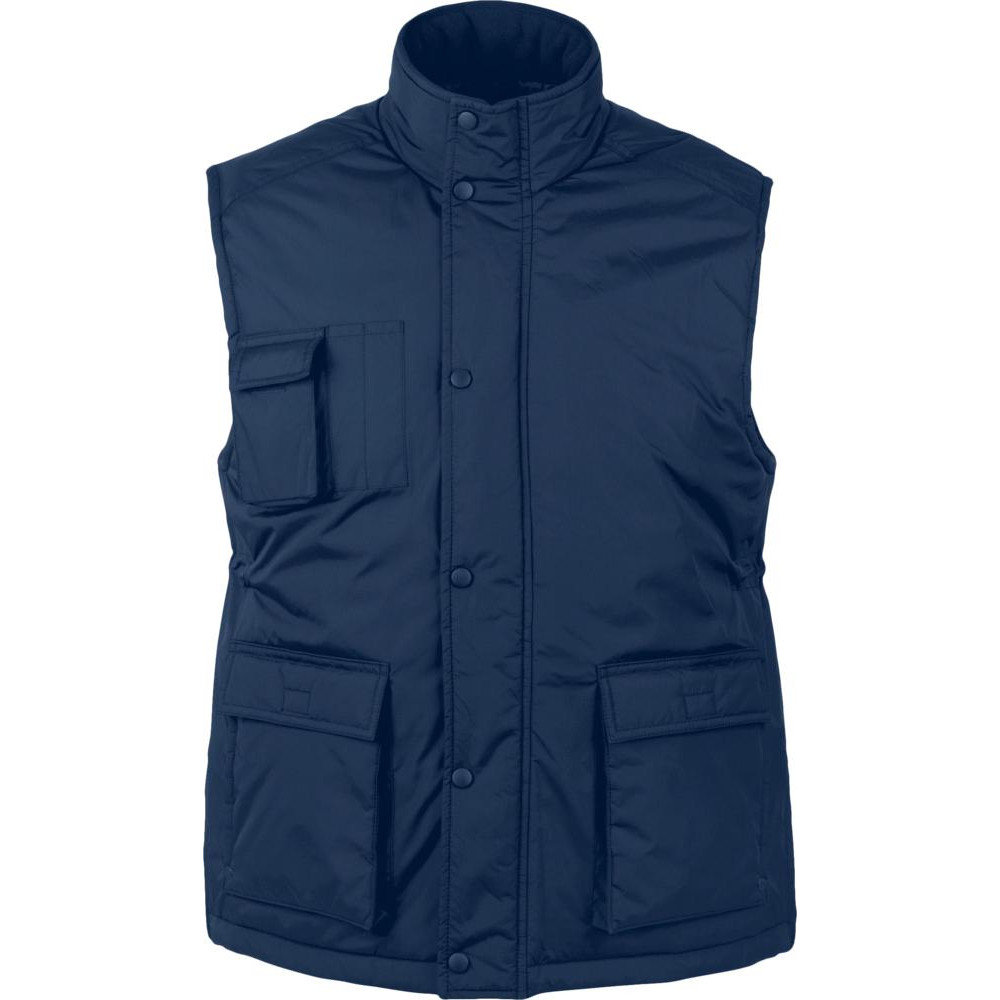 Жилет унисекс из ткани «рипстоп». Высокий воротник на кнопках, на подкладке из флиса. Расстегивается при помощи молнии и кнопок.