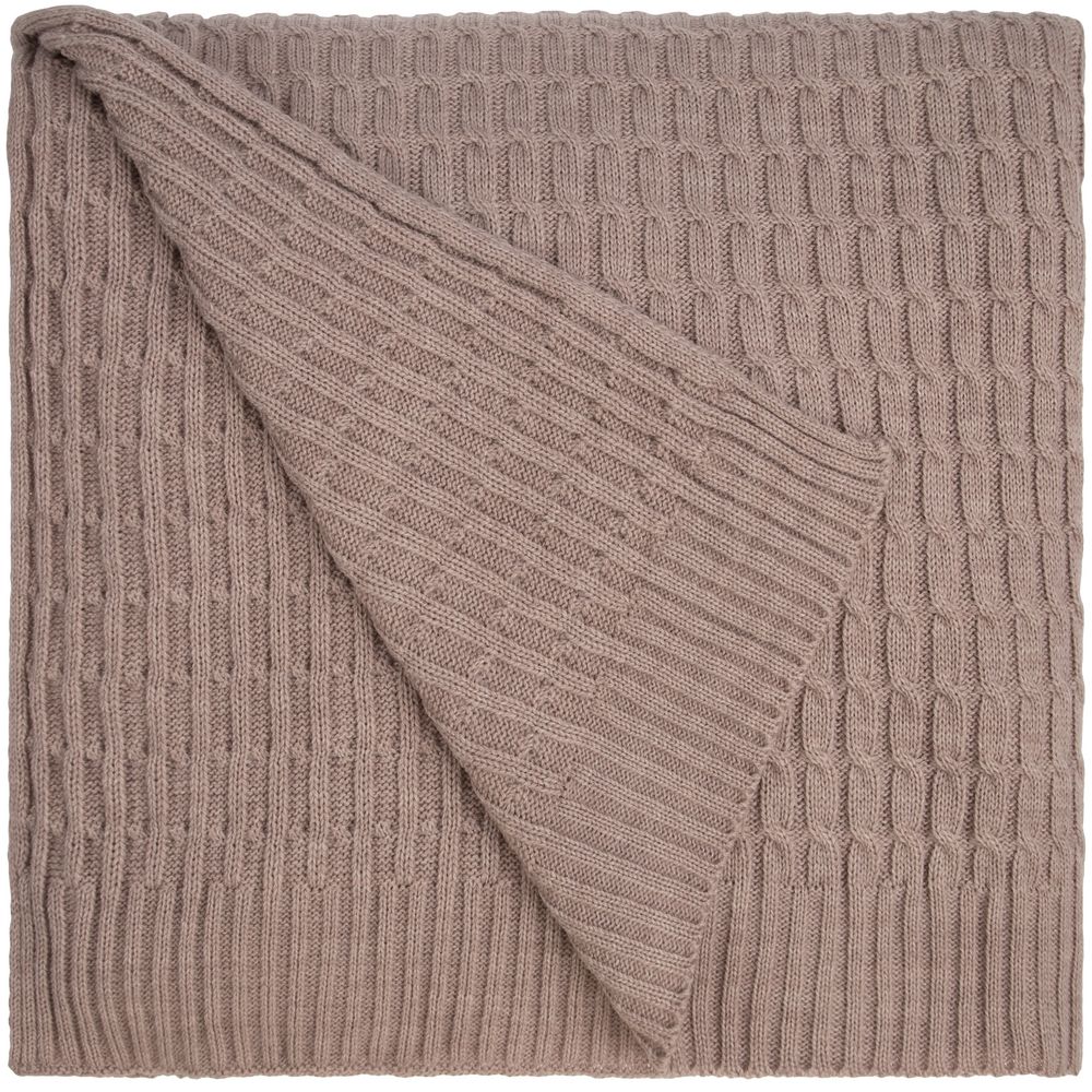 Модель: однотонный плед с фактурной вязкой, которая позволяет сделать его воздушным и объемным. Чередуя различные типы петель на гладком полотне, можно вывязать любую графику — логотип, текст, товарный знак.