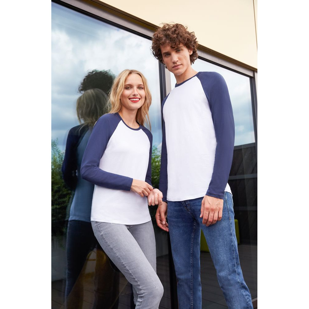 Мужская двухцветная футболка с боковыми швами, длинным рукавом реглан и закругленным низом.