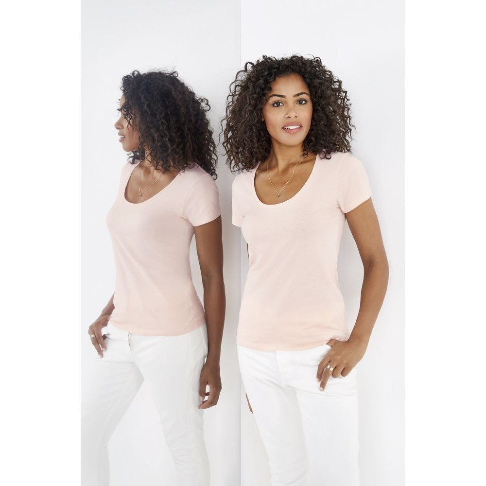 Женственная футболка с глубоким круглым вырезом.