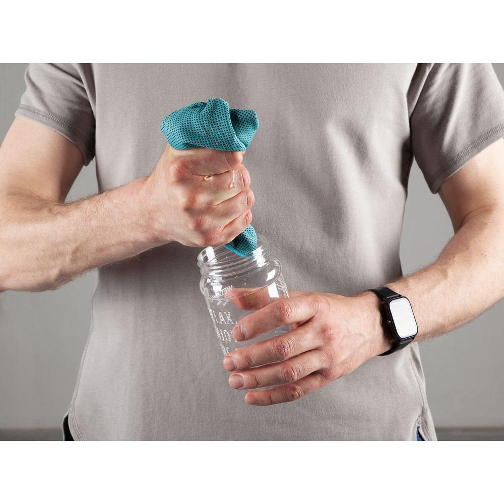 При хранении в бутылке полотенце сохранит охлаждающий эффект в течение нескольких часов. Благодаря крышке-карабину ее удобно прицепить на рюкзак или сумку.
