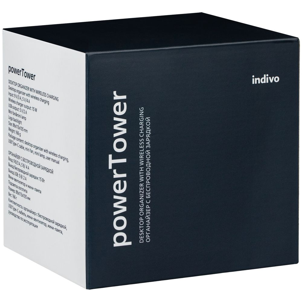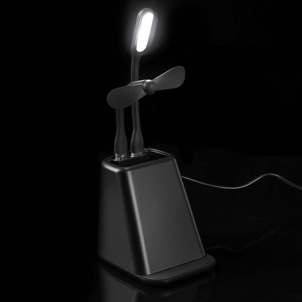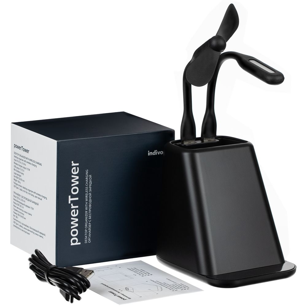 Настольный органайзер с зарядкой, лампой, вентилятором и подсветкой логотипа powerTower, черный