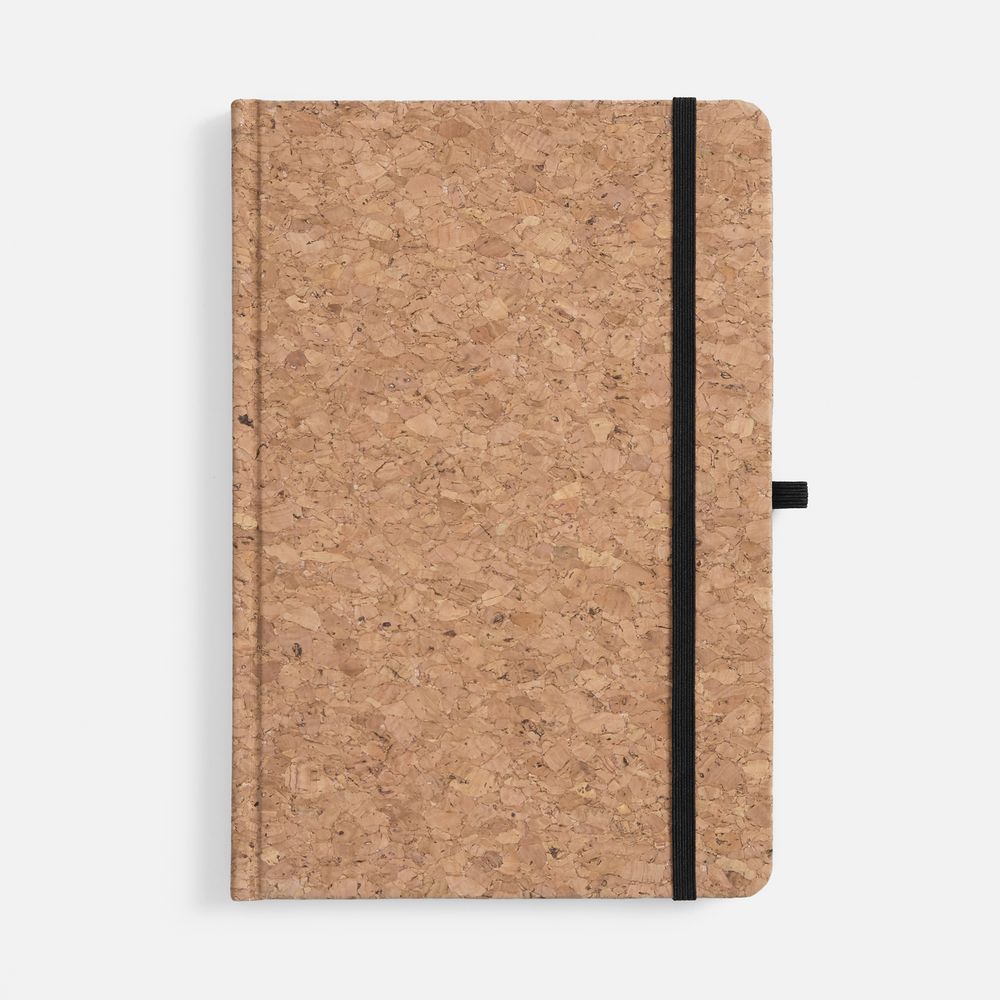 Блокнот в твердой обложке из натуральной неокрашенной пробки, дополнен цветными петлей-резинкой для ручки, ляссе и резинкой на обложку.
