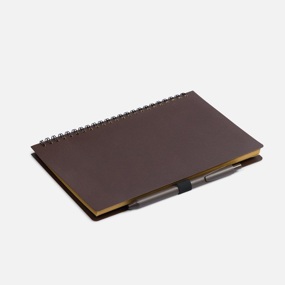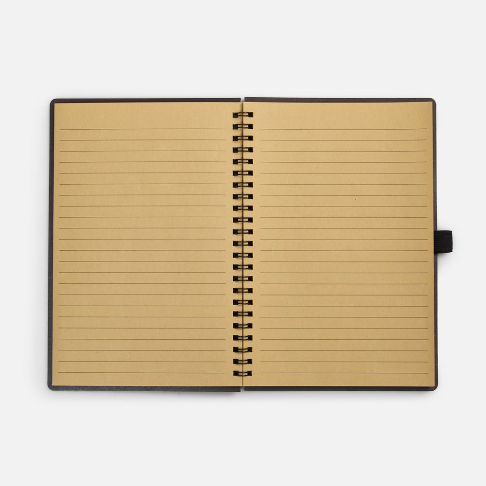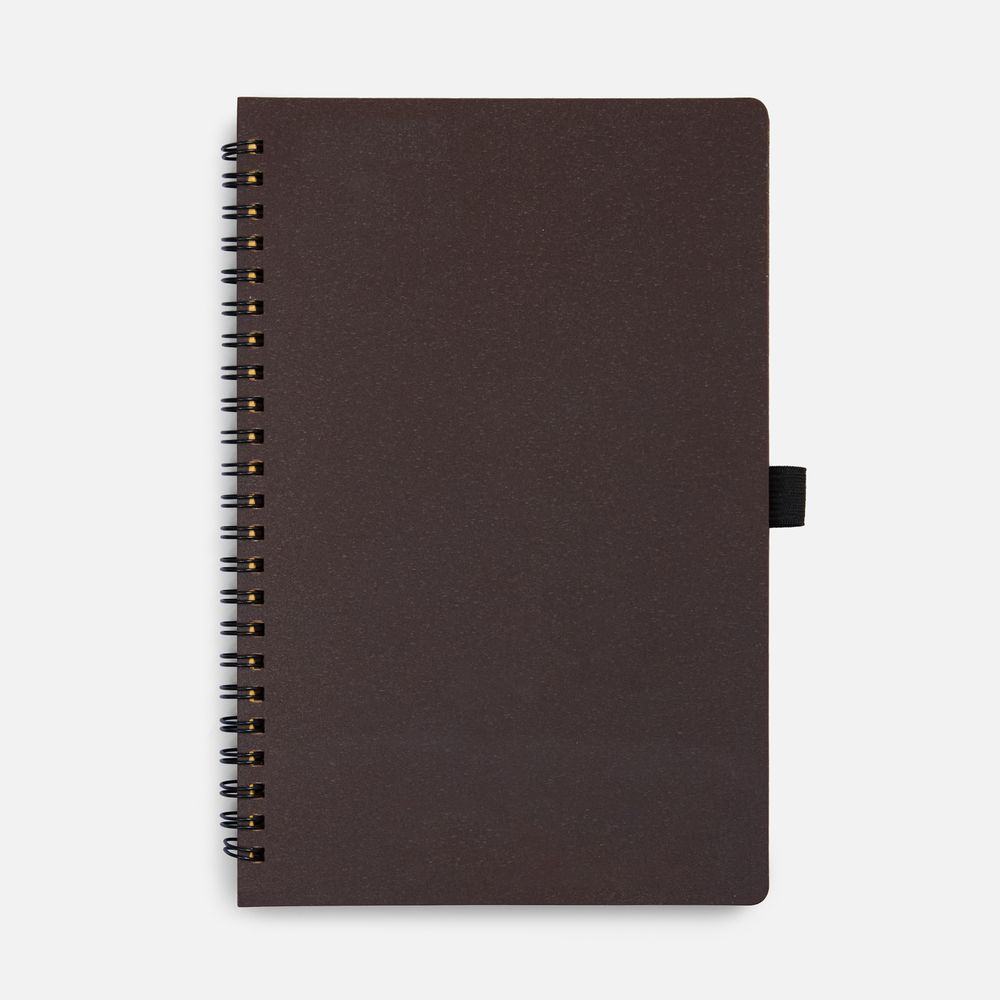 Блокнот на спирали из пластика и кофейного жмыха, дополнен резинкой для ручки.