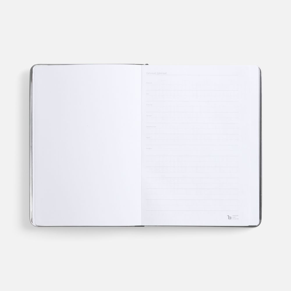 Ежедневник с твердой обложкой и серебристым обрезом блока. Выполнен из материала Nubuck, серый СС, дополнен серым ляссе и металлическими рамками с двух сторон обложки.