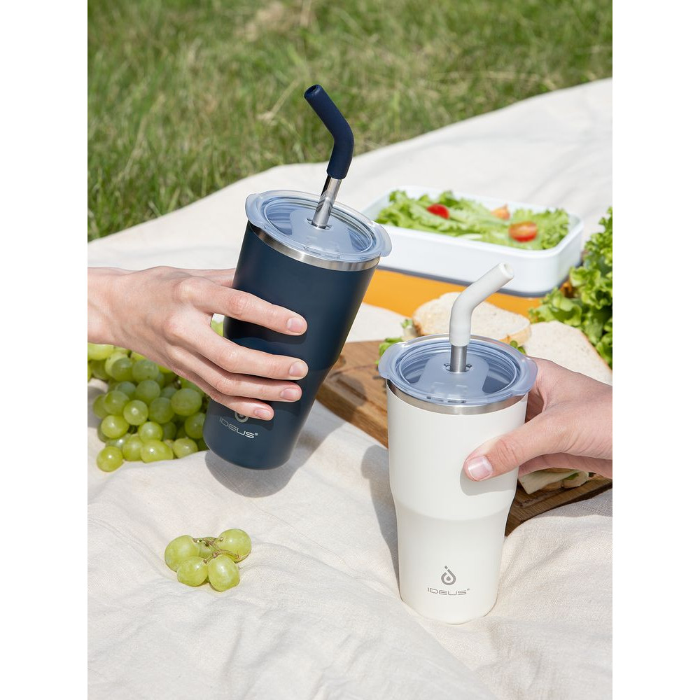 - 2 крышки в комплекте: одна на 100% герметичная с механизмом блокировки отверстия для питья, вторая — с отверстием для трубочки