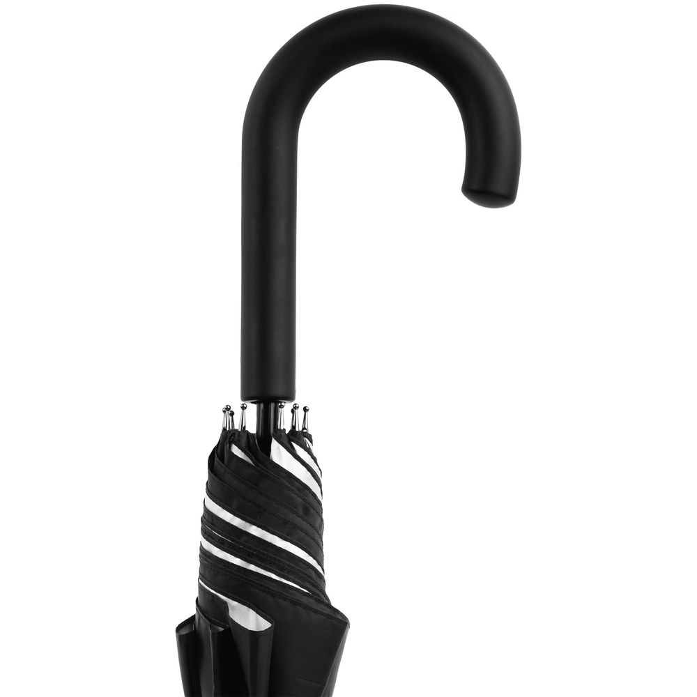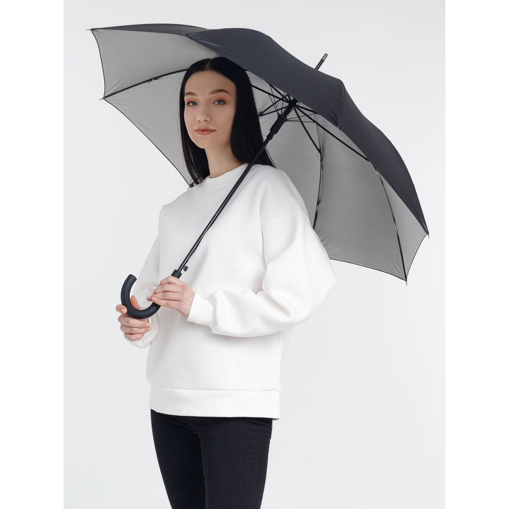 Легкий зонт-трость классической формы, который выглядит нескучно благодаря современным деталям исполнения — серебристому покрытию на внутренней части купола и мягкой прорезиненной ручке.