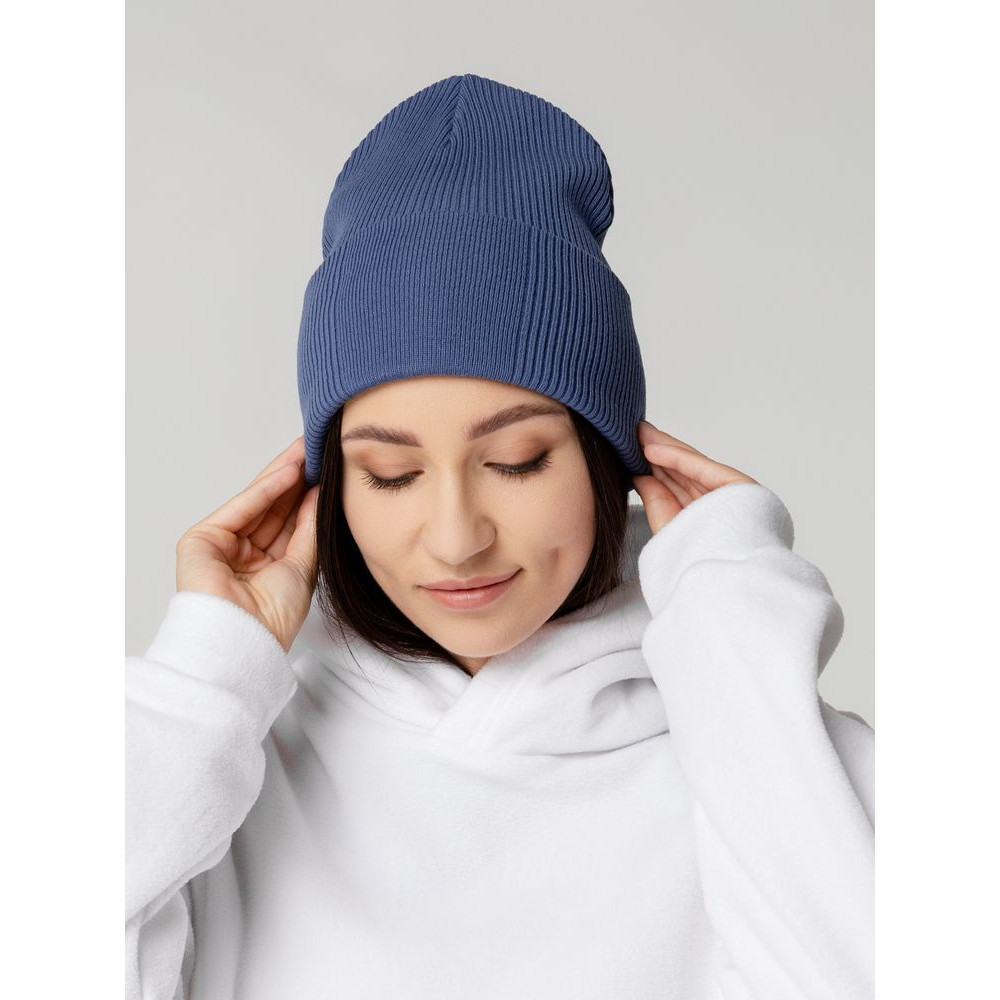 Двухслойная шапка фактурной вязки с отворотом и специальной более гладкой областью под вышивку.