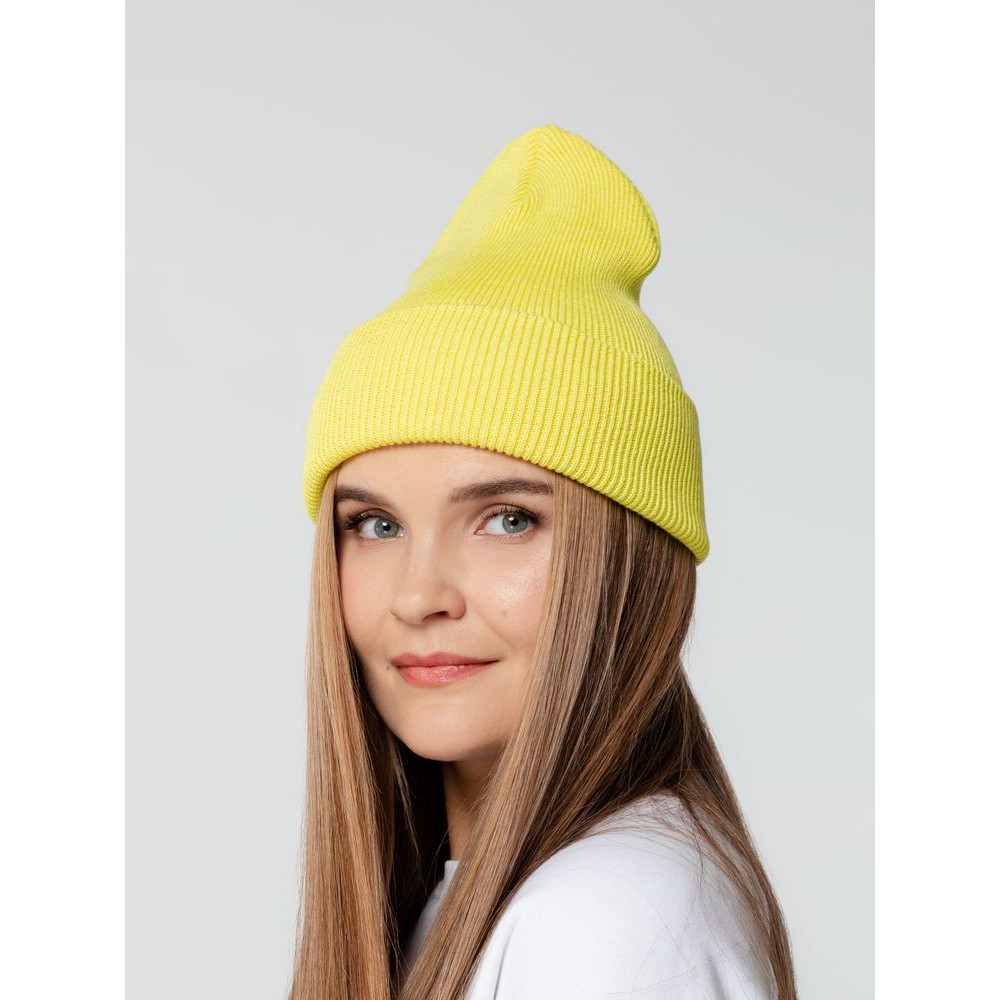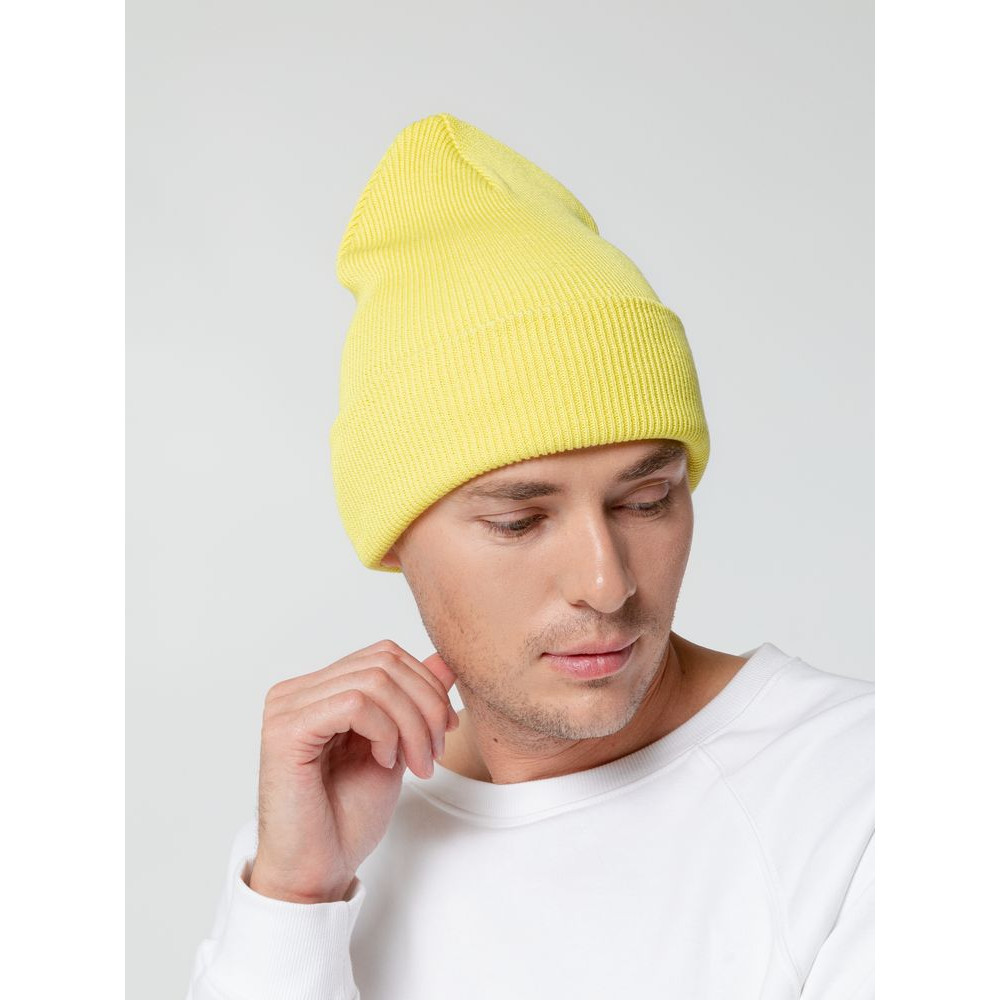 Двухслойная шапка, связанная резинкой, с широким отворотом.